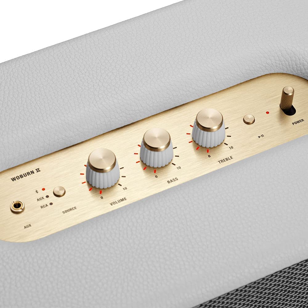 上部には、「音量」「低音」「高音」を調整する、3つのアナログコントロールノブが配置されています。Marshallのギターアンプを彷彿とさせるこの象徴的なノブによって、直感的な音質の調整が可能となっています。