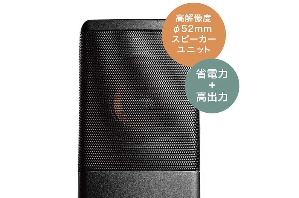 ボーカルや音声が聴きやすい高感度のφ52mm スピーカーユニットを搭載し、長時間でも聴き疲れしないクリアな音質を実現しています。PC やポータブルプレーヤー自体で音を再生するよりも、迫力のあるステレオサウンドを楽しむことができます。トータル4Wの出力ながら、高感度スピーカーユニットにより、省電力でもナチュラルで抜けのよいサウンドを再生します。