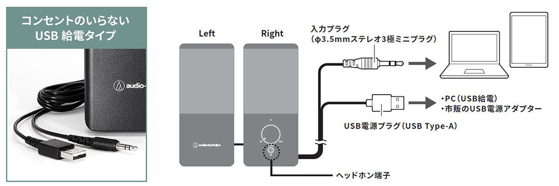 電源はUSB給電タイプとなっており、PCなどのUSB ポートにUSB Type-A プラグを、ヘッドホン端子にφ3.5mm ステレオミニプラグを接続するだけで簡単にセッティングが完了します。有線接続のため、音が遅れて聴こえるような心配もありません。