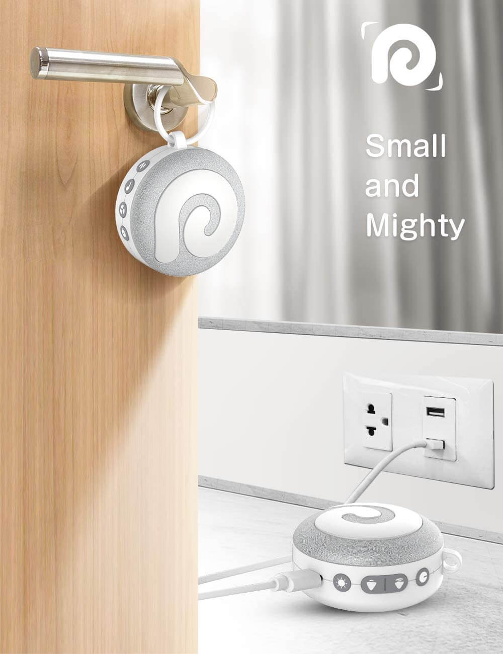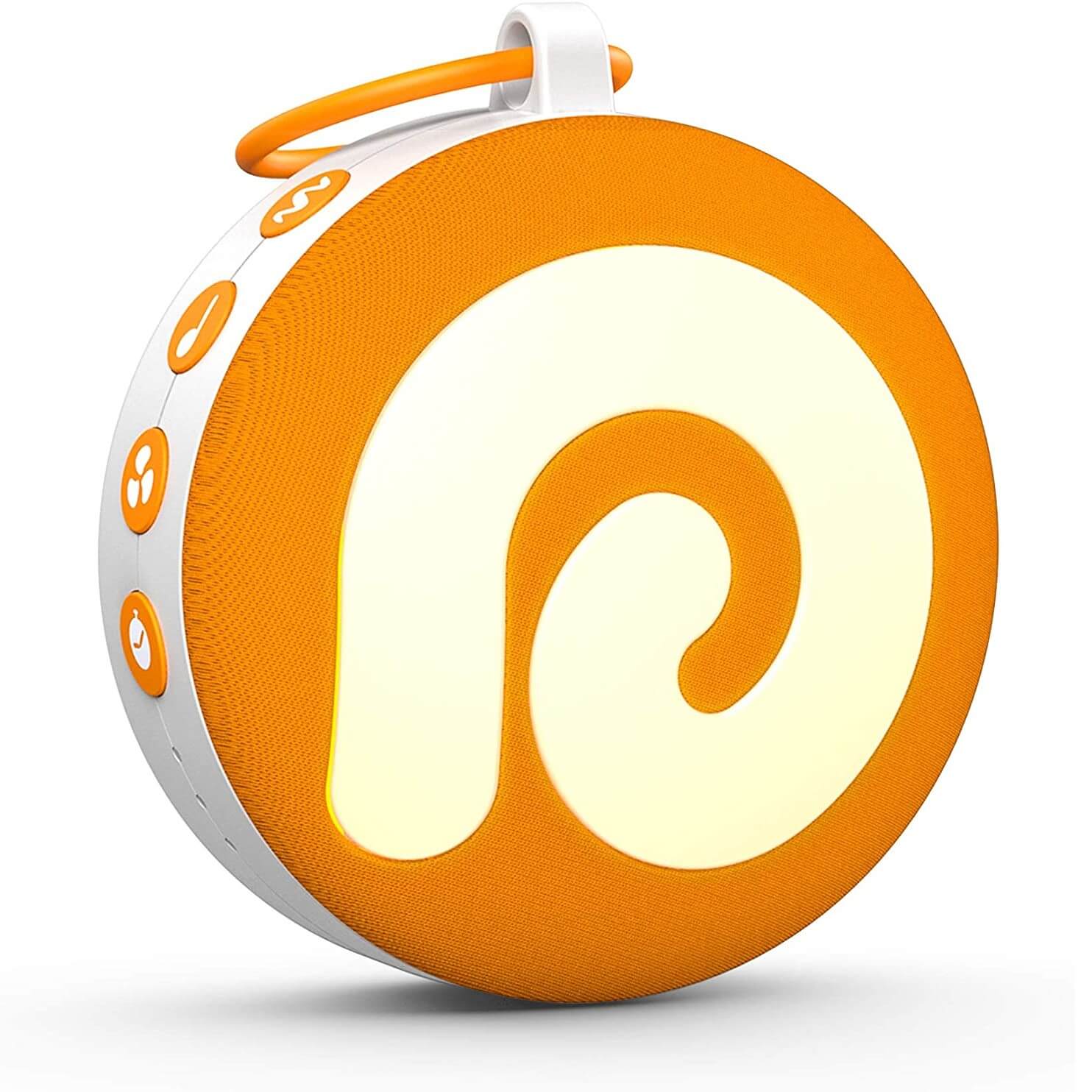 直径 8.5×高さ 4.5 (cm)、重量 260gの手のひらコンパクトサイズなので、使用するときに場所を取らず、持ち運びにも便利です。吊り下げ用フックストラップを付属しており、装着してベビーカーやベビーベッド、デスクサイドなどに吊り下げることも可能です。