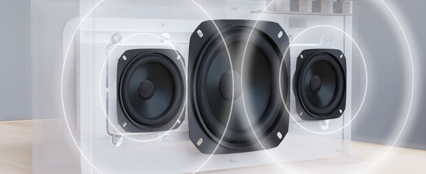 52mm ツィーターを2基、100mm ウーファーを1基搭載しており、コンパクトなサイズながら、総出力80W (15W+15W+50W)の広範囲に響き渡る大出力サウンドを実現しています。