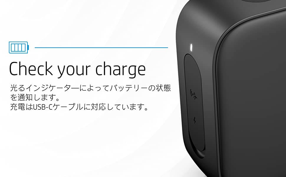 充電式バッテリーを搭載し、25時間の連続再生が可能となっています(50% volume)。充電はUSB Type-C接続で、スマホの充電ケーブルと兼用可能です。