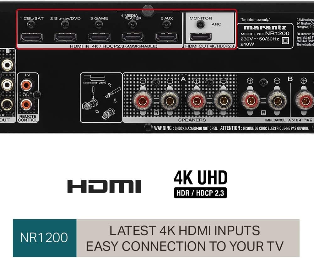 HDMIコントロール機能(CEC)に対応しており、テレビと電源ON/OFFを連動させたり、テレビのリモコンでNR1200の音量を調整したりすることができます。また、4K対応チューナーやビデオプレーヤーなどから入力した映像をパススルーすることができます。