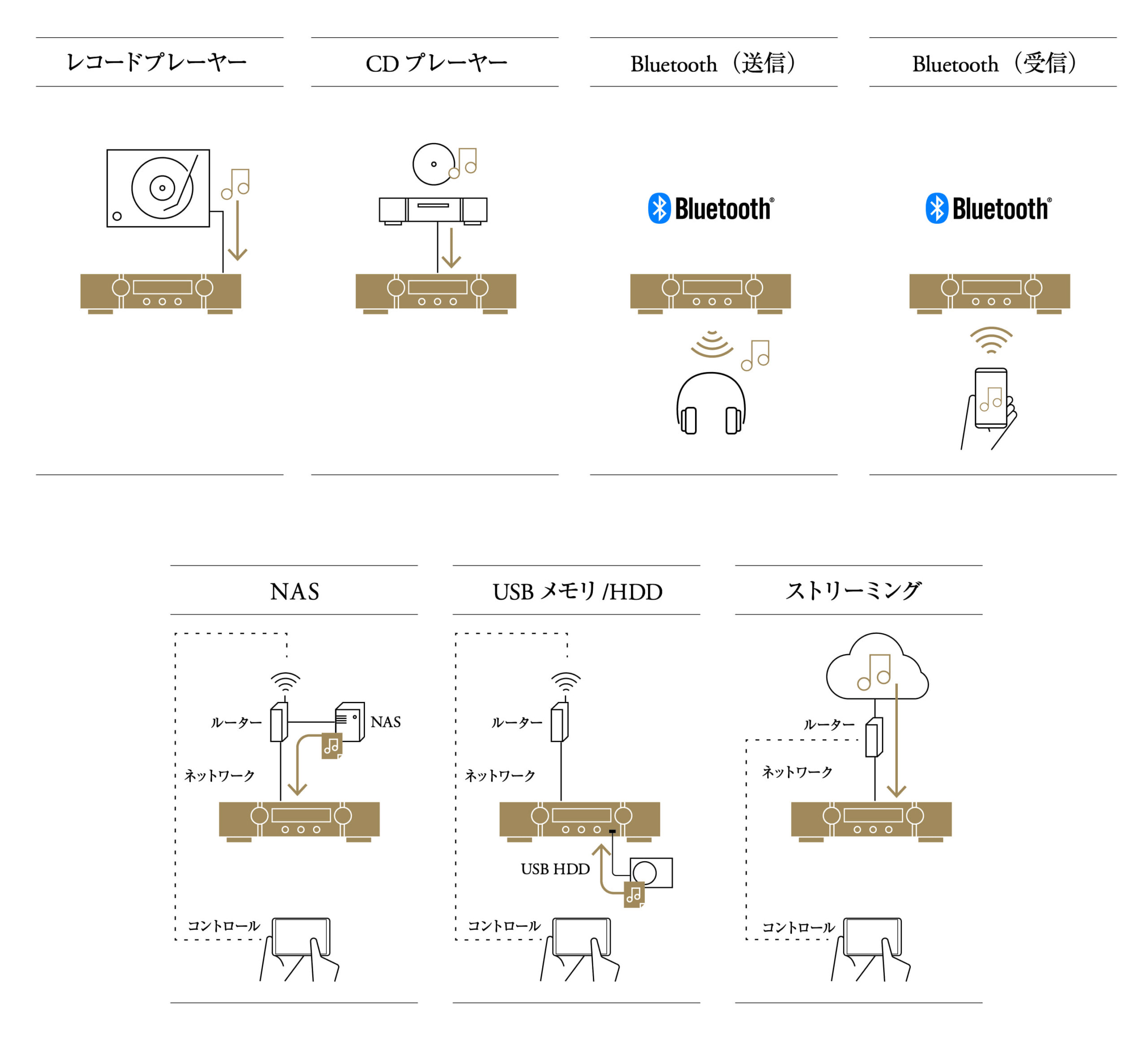 ストリーミングサービス(Amazon Music HD、AWA、Spotify、SoundCloud)やインターネットラジオ(TuneIn)、PCNASUSBメモリーに保存した音源など、ありとあらゆる音源を再生することができます。