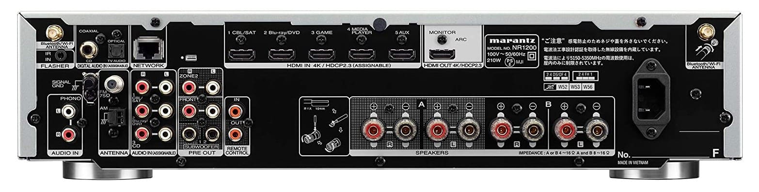 その他の端子 ネットワーク×1、USB(フロント)×1、 Bluetooth / Wi-Fiアンテナ入力×2、 FMアンテナ入力×1、AMアンテナ入力×1、 マランツリモートバス(RC-5)入出力×1、IRフラッシャー入力×1