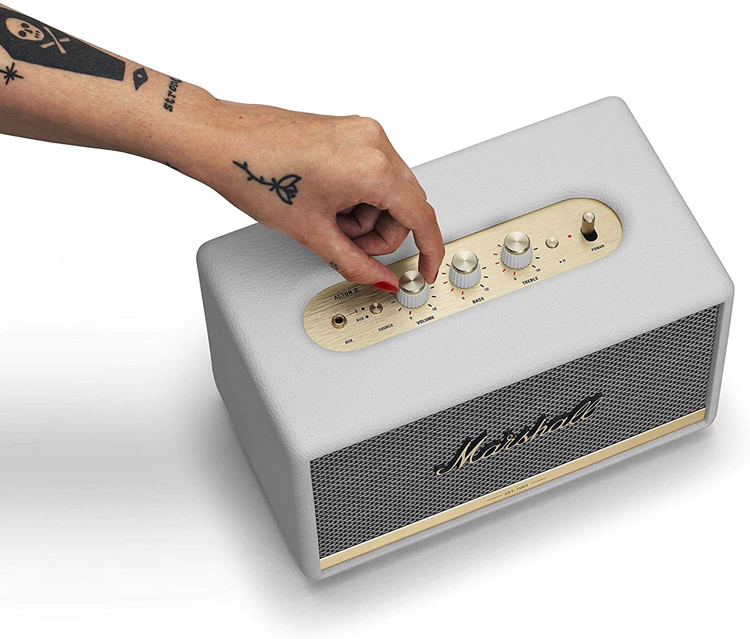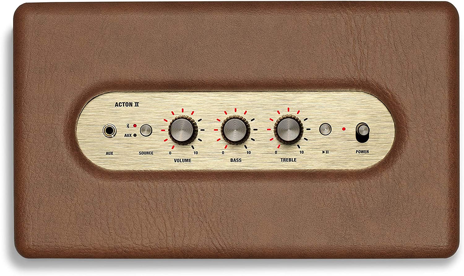 トップには、「音量」「低音」「高音」を調整する、3つのアナログコントロールノブが配置されています。Marshallのギターアンプを彷彿とさせるこの象徴的なノブによって、直感的な音質の調整が可能となっています。