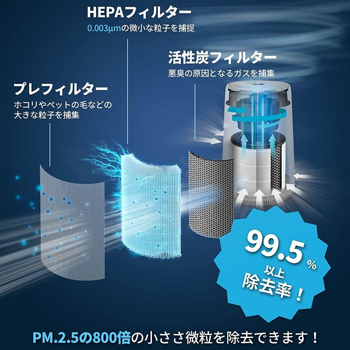 | フィルター | 3層(プレフィルター、HEPAフィルター 、活性炭フィルター) |