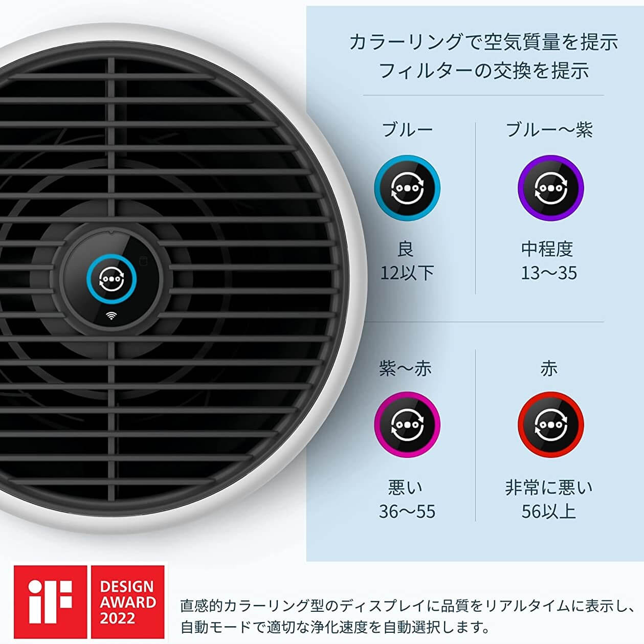 オートモードではプロ仕様の空気質センサーにより、1秒間に1000回空気をスキャンして有害な汚染物質を検出、環境に適した清浄速度を選択します。空気の質がリアルタイムでディスプレイに表示され、アレルゲンとPM2.5のレベルを数値と色で視認することが出来ます。