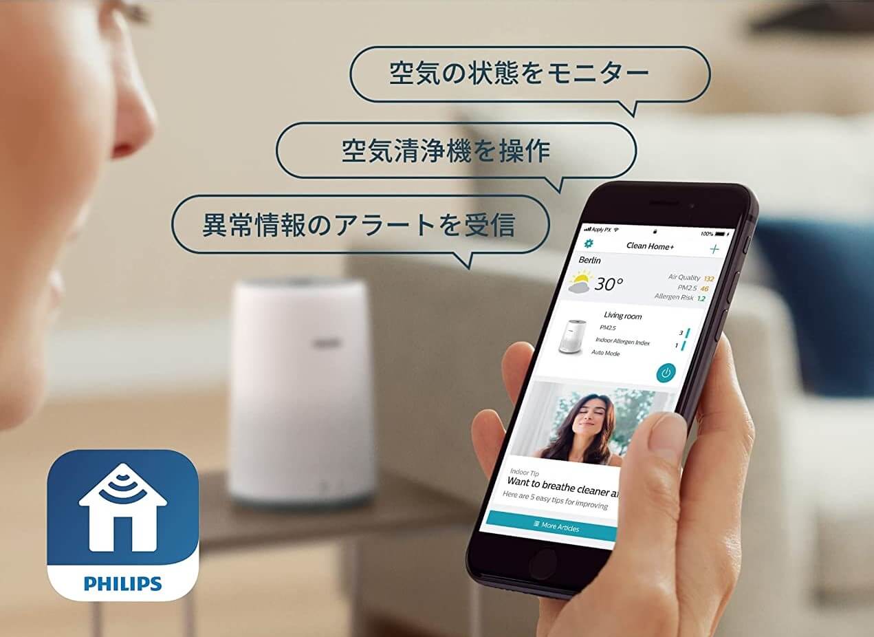 専用アプリPhilips Air+を使用することで、外出中も空気状況をモニタリングし、本体を操作することができます。空気質が適切でない場合はアラートを表示します。