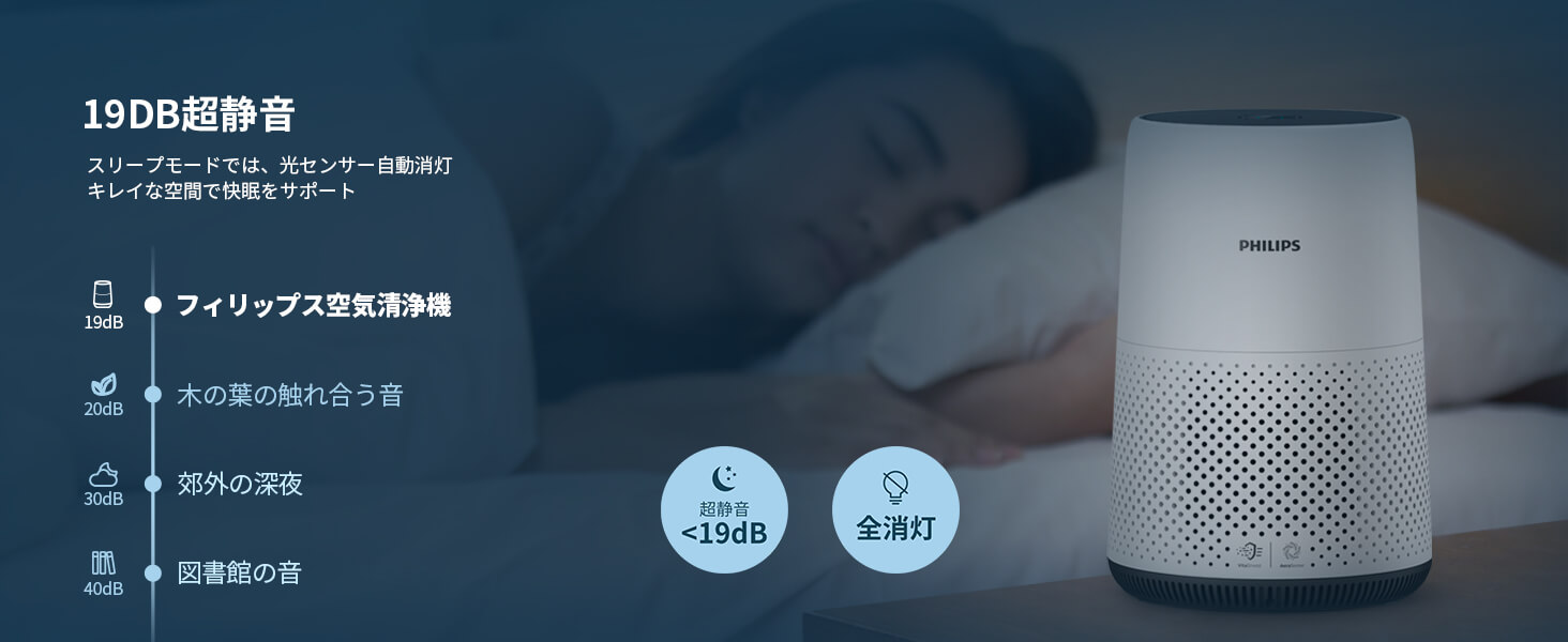 スリープモードは19dBの超静音運転で、赤ちゃんやペットにもストレスを感じさせません。光センサーにより、ランプが自動消灯するので、睡眠に集中することが出来ます。