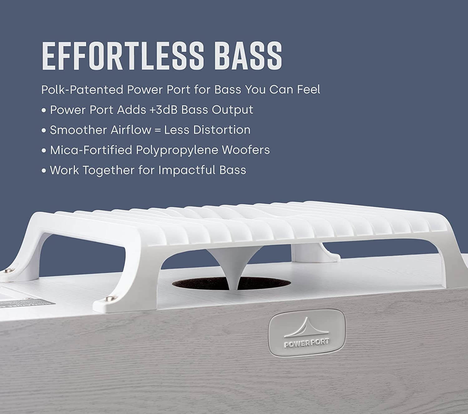 Polk Audioの特許技術であるパワーポートを底面に搭載しており、クリアな低音再生を実現しています。緻密に設計されたその形状によって、ポートを出入りする空気の流れをスムーズにし、従来のバスレフポートよりも歪みや乱流を大幅に抑えることができます。さらに、開口部の表面積を拡張することにより、一般的なバスレフポートに比べて約3dBの出力アップを実現しています。