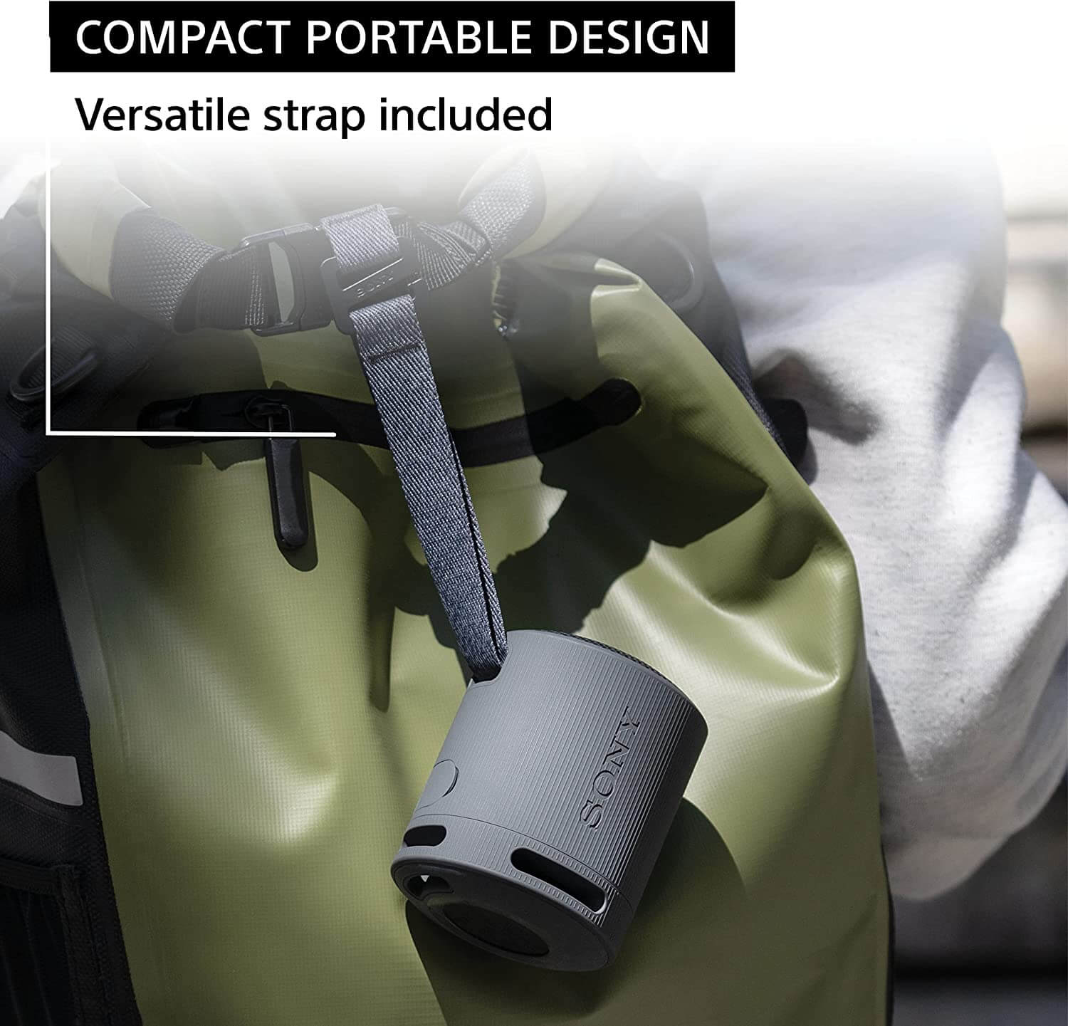 取り外し可能なストラップを付属しており、取っ手やバッグなどに取り付けることが出来ます。マルチウェイ仕様で、スピーカーを上向きにも下向きにもかけられます。