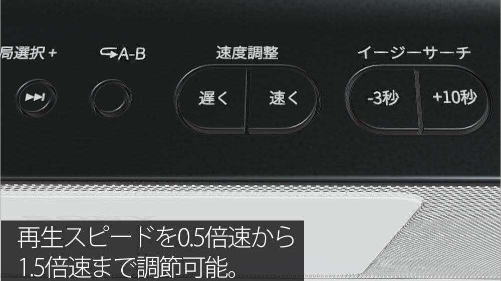 自然な音のまま再生スピードを0.5倍速から1.5倍速まで調節可能なデジタルピッチコントロール、聴きたい場所をくり返し再生するA-Bリピート、一定秒数の早戻し(約3秒)、早送り(約10秒)がボタンひとつで操作できるイージーサーチなど、語学学習のディクテーション(音声の書き取り)や、リスニングに便利な機能を搭載しています。