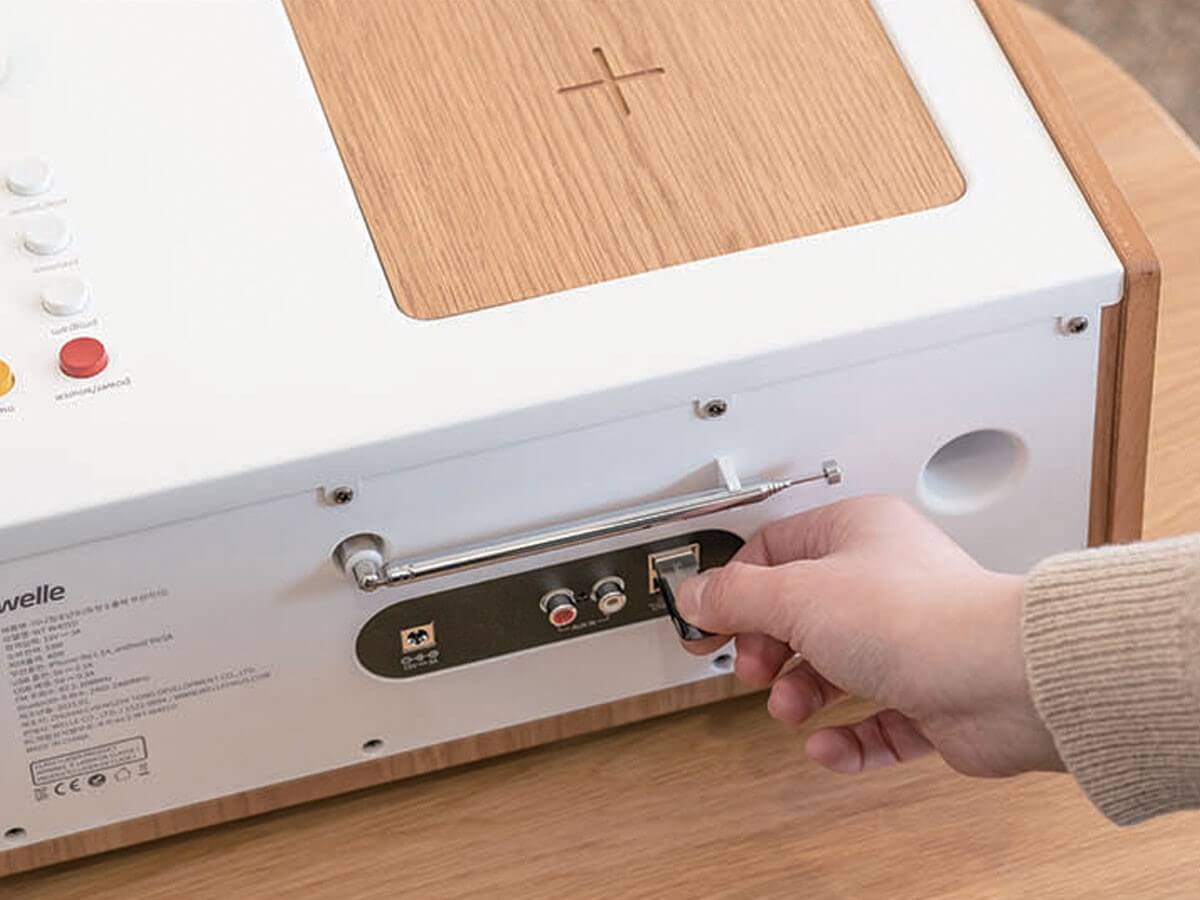 ワイヤレス充電機能を搭載しており、天面のウッドパネルに対応デバイスを置くだけで充電が可能です。背面には電源供給用USBポートを搭載しており、有線での充電も可能です。